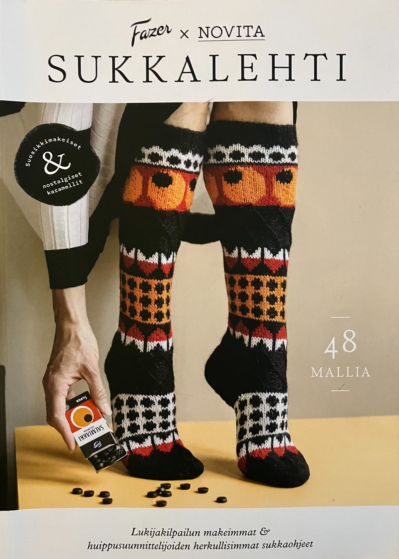 Neuloosini alkoi Fazer x Novita sukkalehdestä, joka ilmestyi syyskuussa 2022. Tämä sukkalehti sisältää todella inspiroivia ja herkullisia sukkaohjeita. Valitsin Ässä Mix I neuleohjeen sivulta 31, mutta kuten jo aikaisemmin totesin, ohje minulle aloittelijana hieman liian vaativa. Langan kuljettaminen kuvioiden mukana oli haastavaa ja sukasta tuli kiristävä. En päässyt haluamaani lopputulokseen. Tein lopulta mallista oman version, koska olin ostanut monta kerää lankoja, jotka olivat todella herkullisen värisiä. Sukista tuli silti mielestäni kivannäköiset ja ne ovat mukavat jalassa. Ehkäpä kokeilen tätä uudelleen myöhemmin, kun taitoni ovat ohjeeseen riittävällä tasolla.